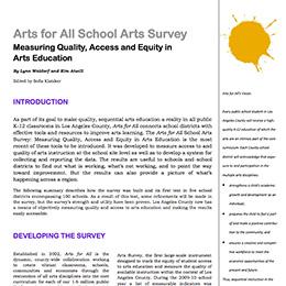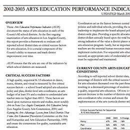 These Arts Education Performance Indicators (AEPI) document the status of arts education in each of the County’’s 82 school districts. As the first ongoing examination of arts education in Los Angeles County, this report provides a framework to evaluate self-reported school district data on critical success factors for arts education.